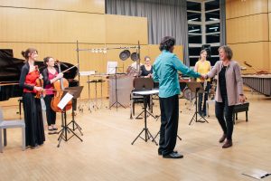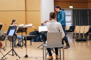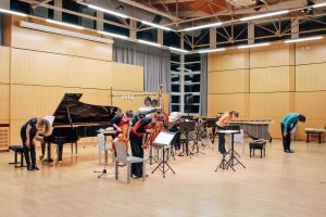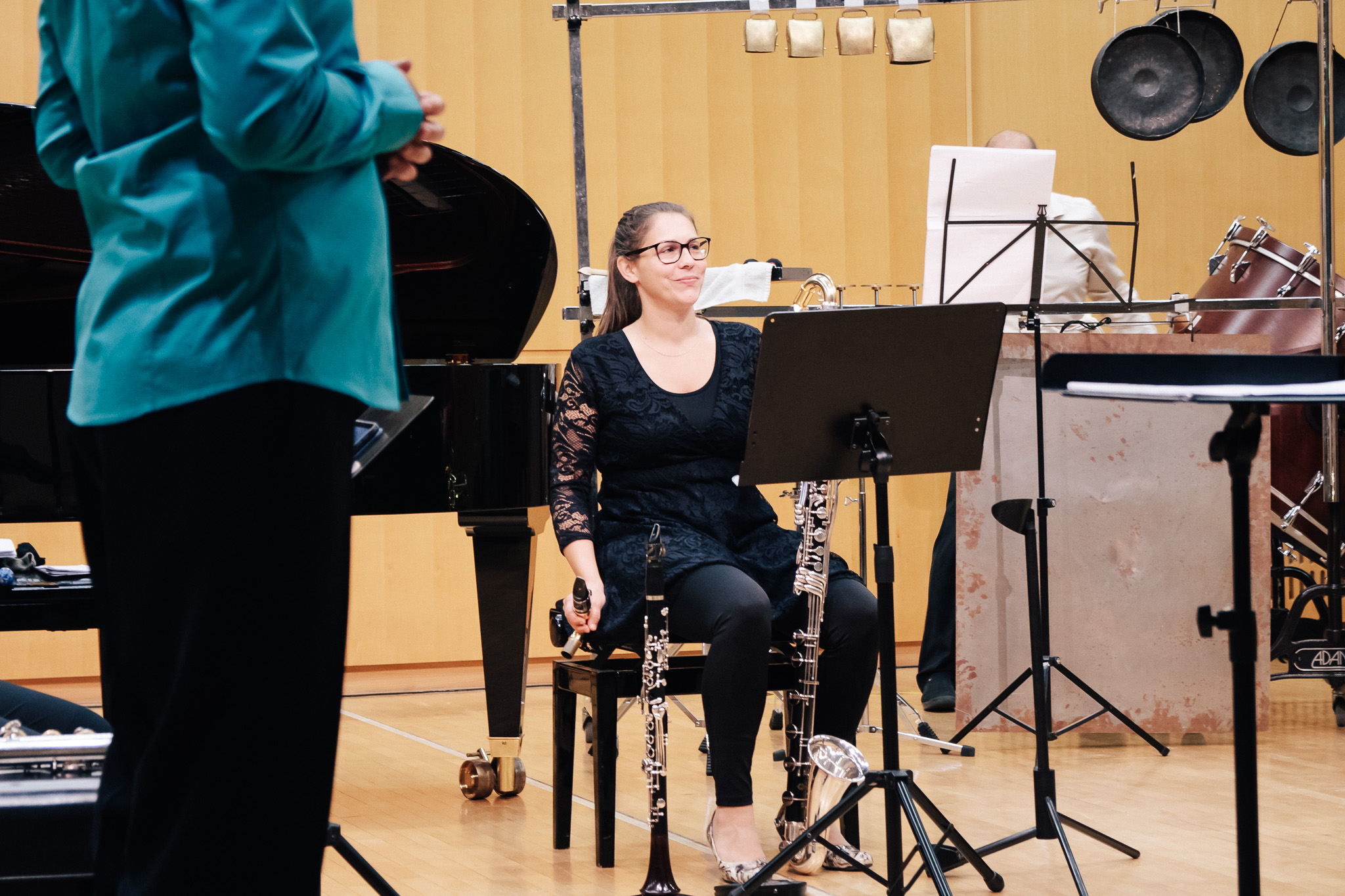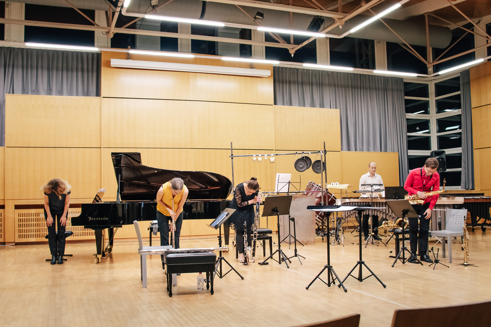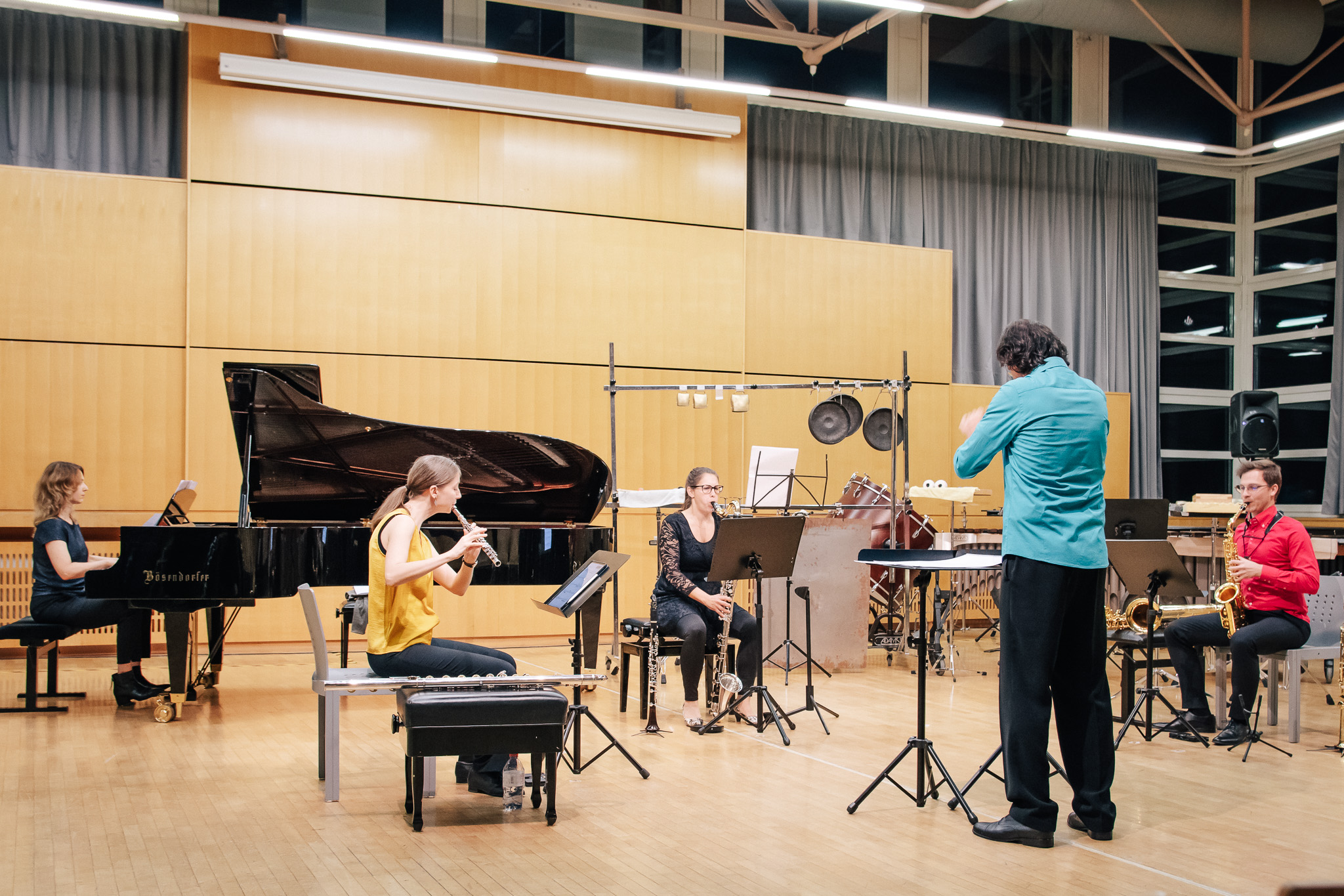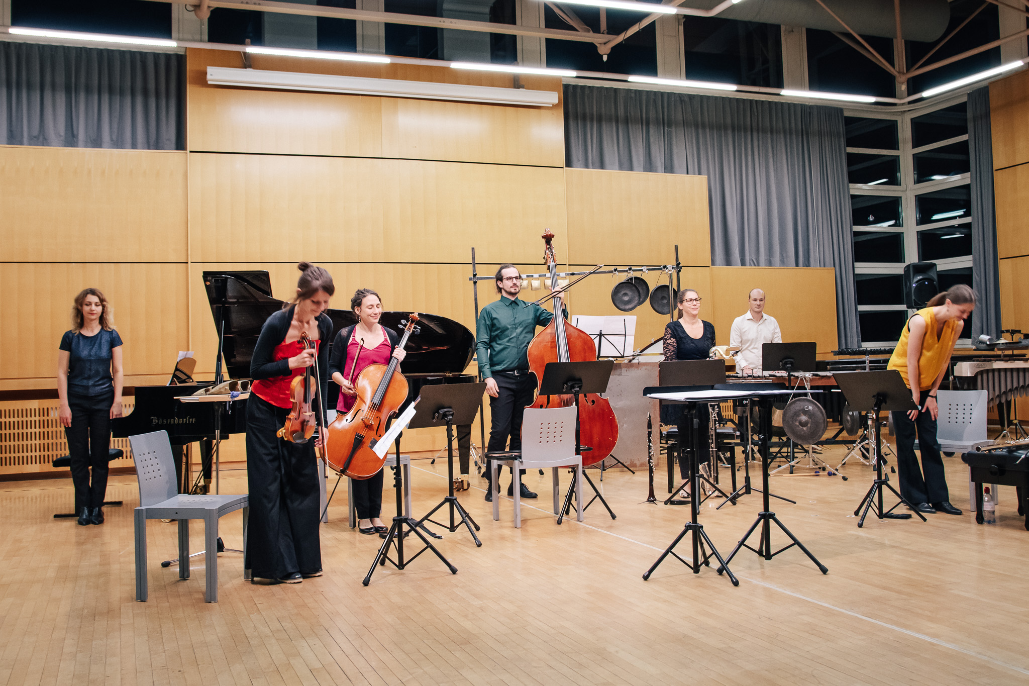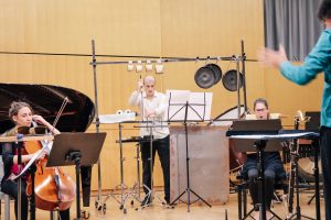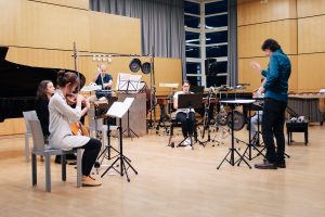 Drei der Komponist*innen waren sogar selbst anwesend: Paul Clift, Urška Pompe und Uroš Rojko. Die Besetzung der Instrumentalist*innen wechselte etwas, so kamen ab dem 3 Stück noch Violine, Cello und für das letzte Stück „Neofonia“ noch ein Kontrabass dazu. Der Schlagwerker hatte mit seinem reichen Instrumentarium reichlich zu tun. Es gab ruhige, schwebende Momente in Paul Clifts „Elan Vital“, strukturell aufgelöste Teile in Urška Pompes „Čez in čez“, rhythmische Passagen in Elnaz Seyedis „Fragmente einer Erinnerung“ und in Uroš Rojkos „Neofonia“ sogar eine einführende Erklärung über die Entstehung und Bedeutung seines Stücks. Der Bezug zu Sarajewo, wo 2016 die Uraufführung stattfand, wurde somit erleuchtet. Im Konzerthaus gab es dann die erneuerte Version mit Kontrabass.