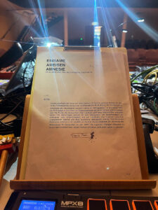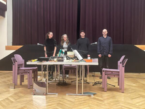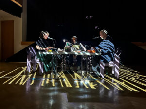 Auf der Bühne fesselte alleine der Aufbau der Protagonisten des Abends – diese nahmen das Publikum fasziniert durch den ganzen Abend mit. Die zum Klangkomic umformierten Texte von Anestis Logothetis -wunderbar toniert und musikalisch begleitet – veranlassten zum Nachdenken und auch Genießen.