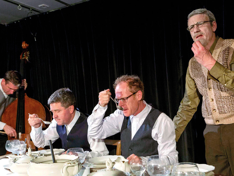 Ausgangspunkt ist der vom Schauspieler gesprochene Text. In einem längeren Präludium sitzen die drei Musiker an einem reich gedeckten Tisch. Sie mimen vorerst stumm verschiedene Essensrituale, ohne auch nur einen Brosamen zu essen. Nach und nach werden Geräusche und Klänge hörbar und es entstehen aus den Essensbewegungen musikalische Abläufe. Die drei Hungerkünstler stellen sich, nachdem der Vater aufgetaucht ist, als seine drei ersten Söhne heraus. Es entsteht eine verklemmte Familienatmosphäre während dem die Söhne von ihren Plätzen am Tisch durch die Worte des Vaters vertrieben werden. Sie finden sich mit ihren Instrumenten auf engstem Raum wieder. Dort kuschen sie oder rebellieren mit ihren instrumentalen Einschüben, während der Vater vor seinem aufgetürmten Mahl, essend und trinkend, seine übrigen Söhne analysiert.