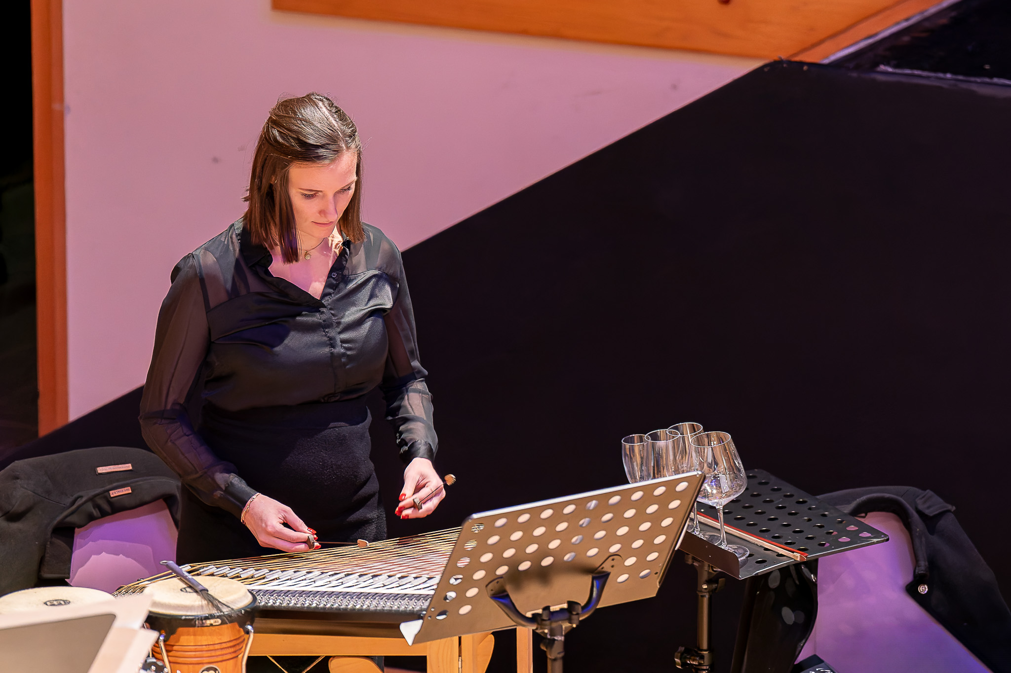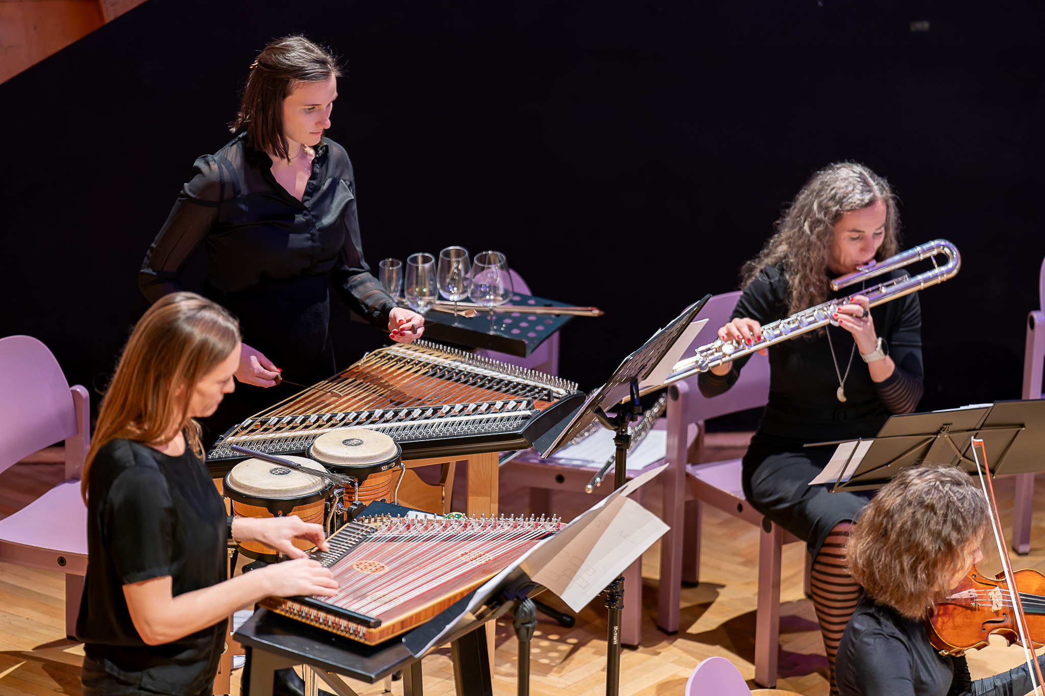Das Programm spannte einen weiten Bogen durch unterschiedliche ästhetische Positionen der Neuen Musik. Den Auftakt bildete Anna Skladannayas Der letzte Mondschein, das mit feinen klanglichen Schattierungen und poetischer Zurückhaltung eine dichte Atmosphäre schuf. Es folgte Relief von Alexandra Karastoyanova-Hermentin, ein Werk von plastischer Klanggestaltung und markanten Kontrasten.